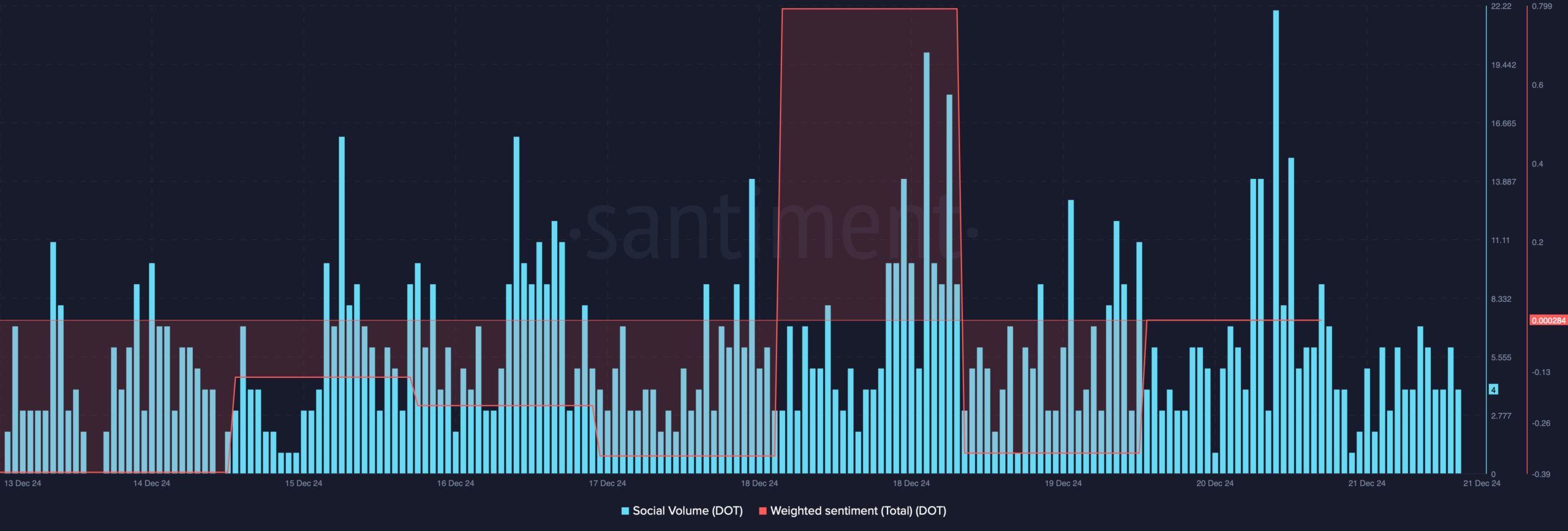 Wenn die Zahl sinkt, deutet dies darauf hin, dass die Stimmung in Bezug auf einen bestimmten Token pessimistischer wird. Sein soziales Volumen stieg im Abwärtstrend tatsächlich an, was darauf hindeutet, dass Investoren über Polkadot diskutierten.