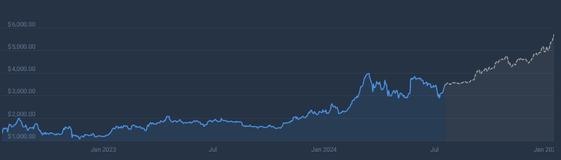 An diesem Punkt ist klar, dass die Preisvorhersagen von Ethereum optimistisch sind. Diese Prognose zeigt einen stetigen Preisanstieg über alle Zeiträume hinweg, mit einem bemerkenswerten Anstieg im Sechsmonats- und Dreimonatszeitraum. Das ist sehr interessant.