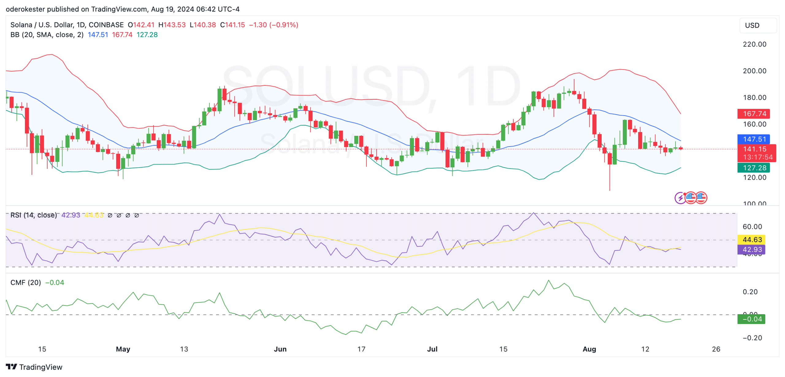 SOL wurde bei 140,76 USD gehandelt, knapp unter der Mitte des Bollinger Bands bei 147,49 USD. Wenn die Volatilität zunimmt, könnte dies auf einen möglichen Abwärtsdruck hindeuten. Eine mögliche Spanne von 167,75 USD bis 127,23 USD ist möglich.