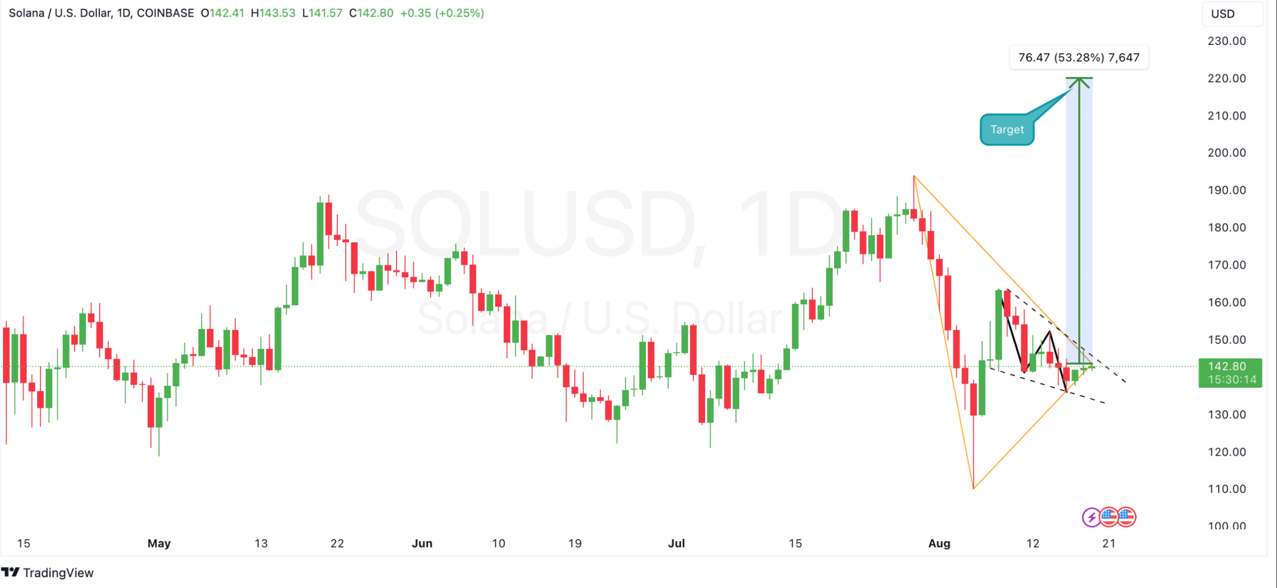 - Das symmetrische Dreiecksmuster von Solana deutet darauf hin, dass die Aktie 220 USD erreichen könnte.