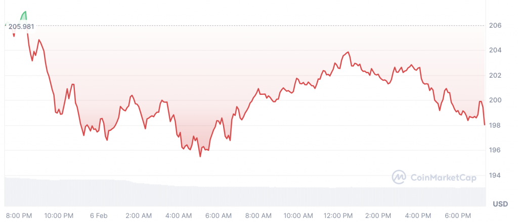 Leider wurde beobachtet, dass der Solana -Markt unter 200 US -Dollar gefallen war. Der Vermögenswert ist in den letzten 24 Stunden mehrmals unter die 200 -Dollar -Marke gesunken. Es erreichte mindestens 195,39 US -Dollar. Sol erreichte seinen höchsten Handelspreis bei 207,39 USD. Der Preis des Vermögenswerts betrug 198,01 USD zum Zeitpunkt der Erstellung dieses Artikels nach einem Rückgang von 3,91% in den letzten 24 Stunden.