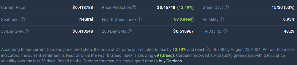 Cardano wurde am 24. Juli 2024 zu 0,418788 USD pro Einheit gehandelt. Prognosen zeigen, dass der Preis am 23. August 2024 auf 0,46748 USD steigen wird, was einer Steigerung von 12,19 % entspricht.