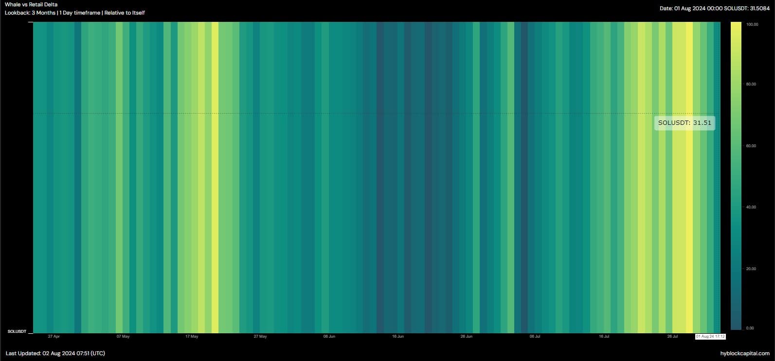 Die Daten von Hyblock zeigen, dass Wale 31,51 % von Solana besitzen. Es war klar, dass die Wale einen größeren Anteil am Gesamtangebot hielten als Kleinanleger.