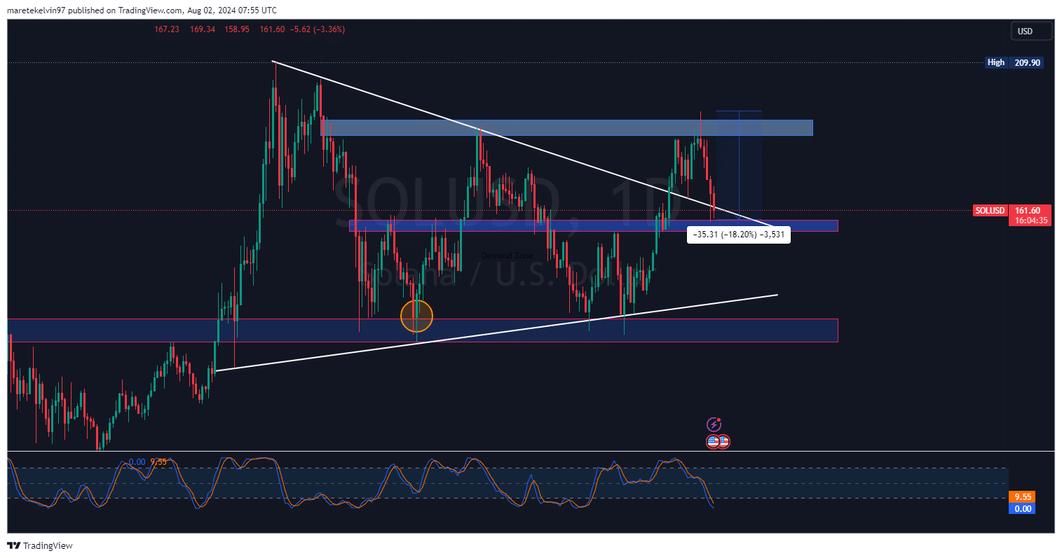 Diese Ablehnung beendete eine frühere Aufwärtsbewegung und führte zu einem aktuellen rückläufigen Trend, der zum Redaktionsschluss das Solana-Unterstützungsniveau von 160 $ testete.