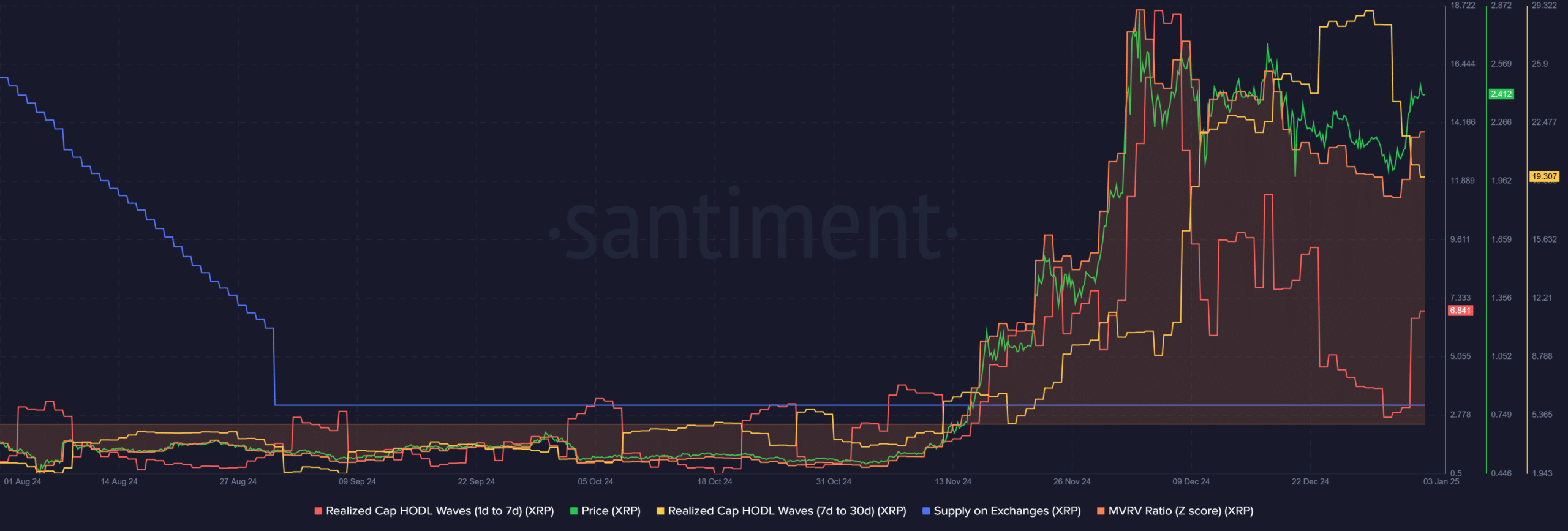 In den Realized Cap HOLD-Wellen gab es einen deutlichen Rückgang der Inhaber, die XRP für einen kurzen Zeitraum hielten, was auf weniger spekulative Händler hindeutet. Während mittelfristig orientierte Anleger eine bescheidene Anhäufung von XRP verzeichneten, deutet dies auf eine gewisse Zuversicht hin, dass sie XRP trotz eines begrenzten Preistrends halten werden.