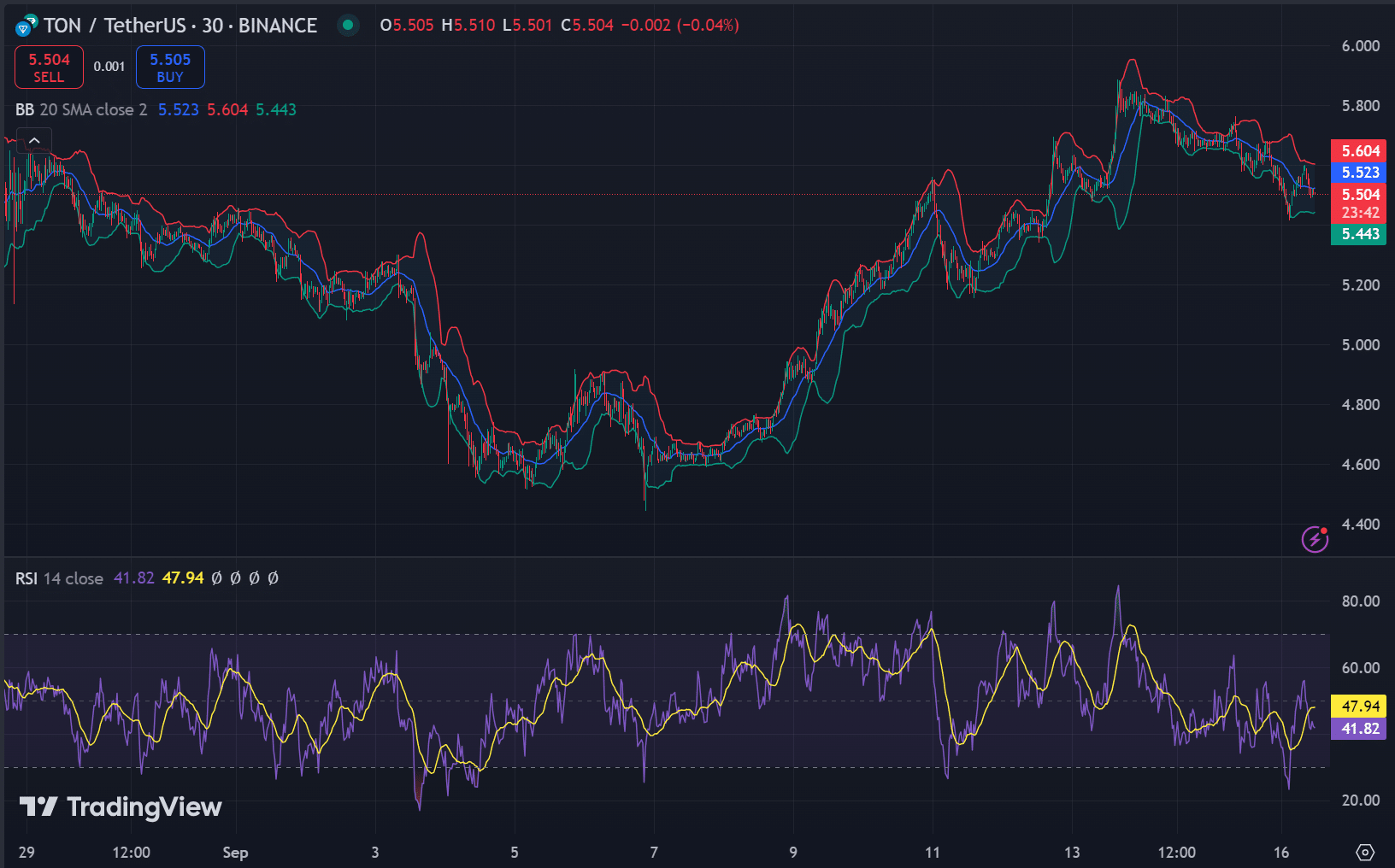 In Kombination mit technischen Indikatoren wie Bollinger Bands und RSI schien sich Toncoin an einem kritischen Punkt zu befinden.