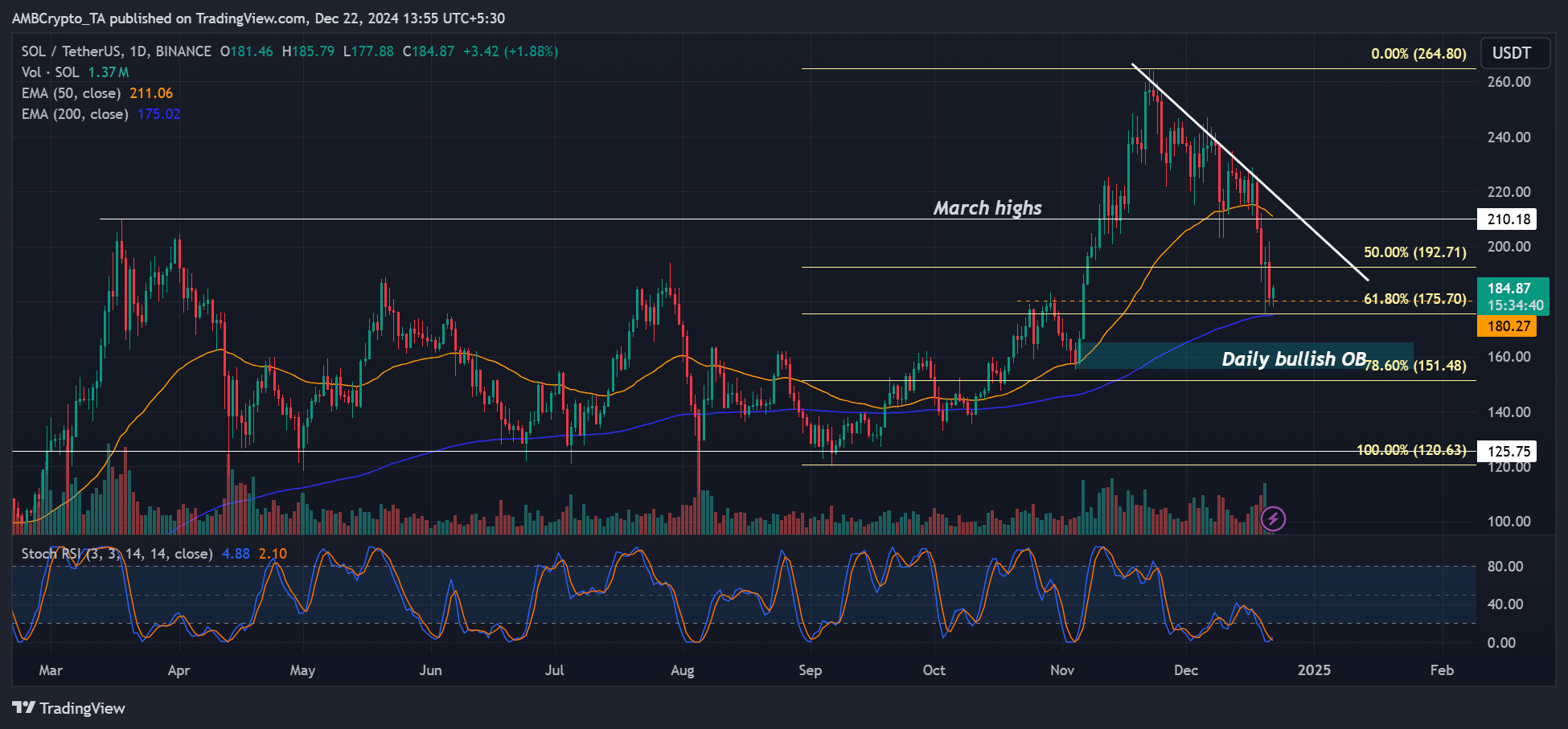 SOL ist von seinem Höchststand von 264 $ im November auf nur noch 175 $ gesunken. Der Rückzug hat jedoch eine kritische Konfluenzzone erreicht, die, wenn sie anhält, Martys These bestätigen würde.