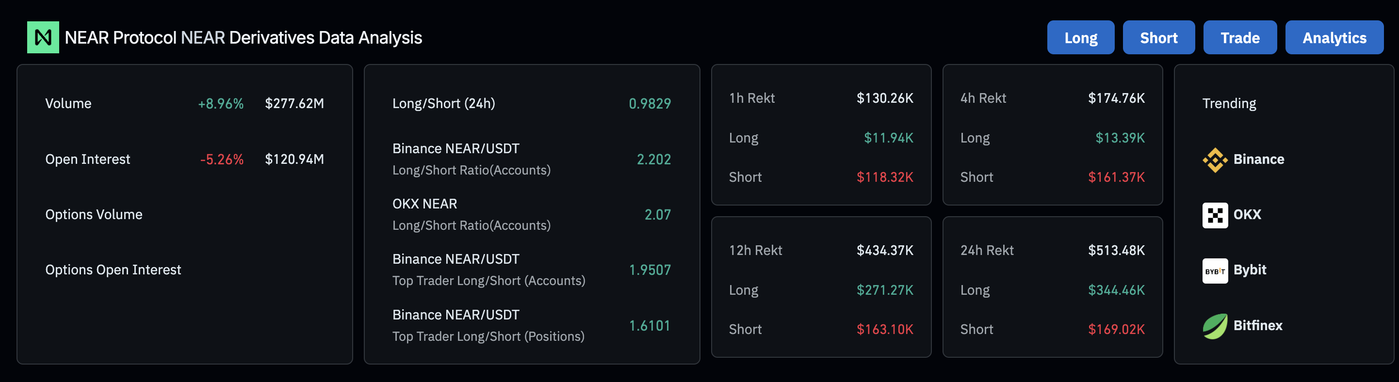 Die jüngsten Derivatestatistiken haben die aktuelle pessimistische Stimmung verstärkt. NEAR steigerte sein Volumen um 8,96 % und erreichte insgesamt 277,62 Mio. USD. Das Open Interest fiel um 5,26 % auf 120,94 Mio. USD.