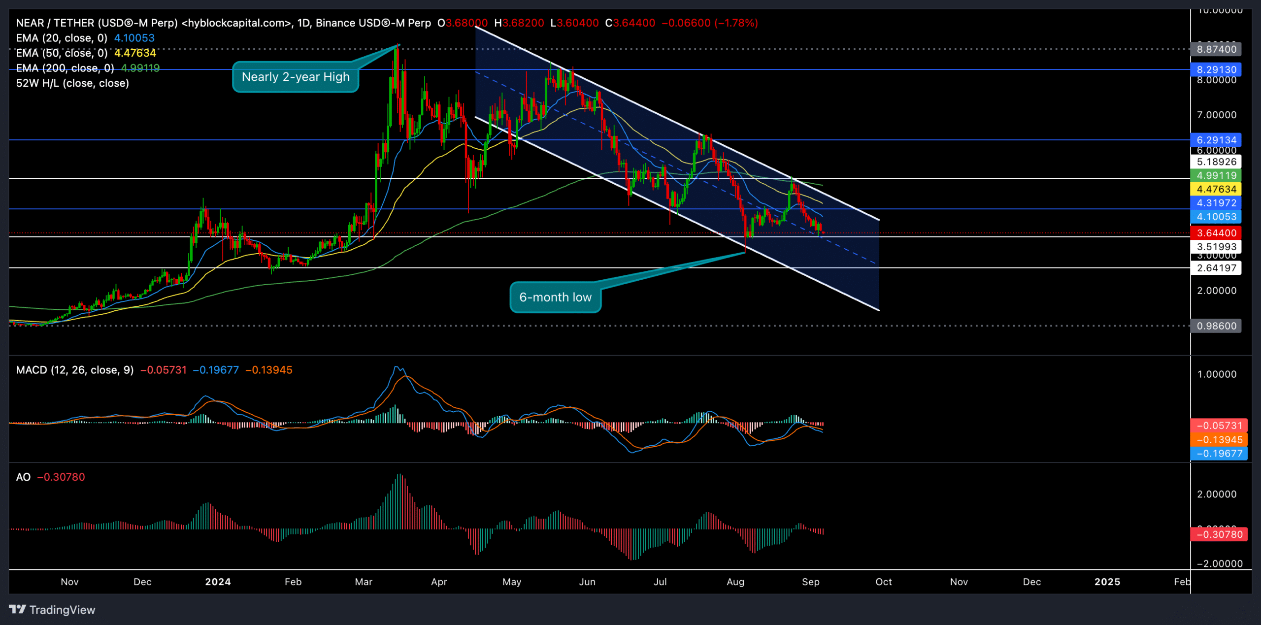 - NEAR fiel kürzlich unter die 20-, 50- und 200-Tage-EMAs, was auf starken Verkaufsdruck hindeutet.