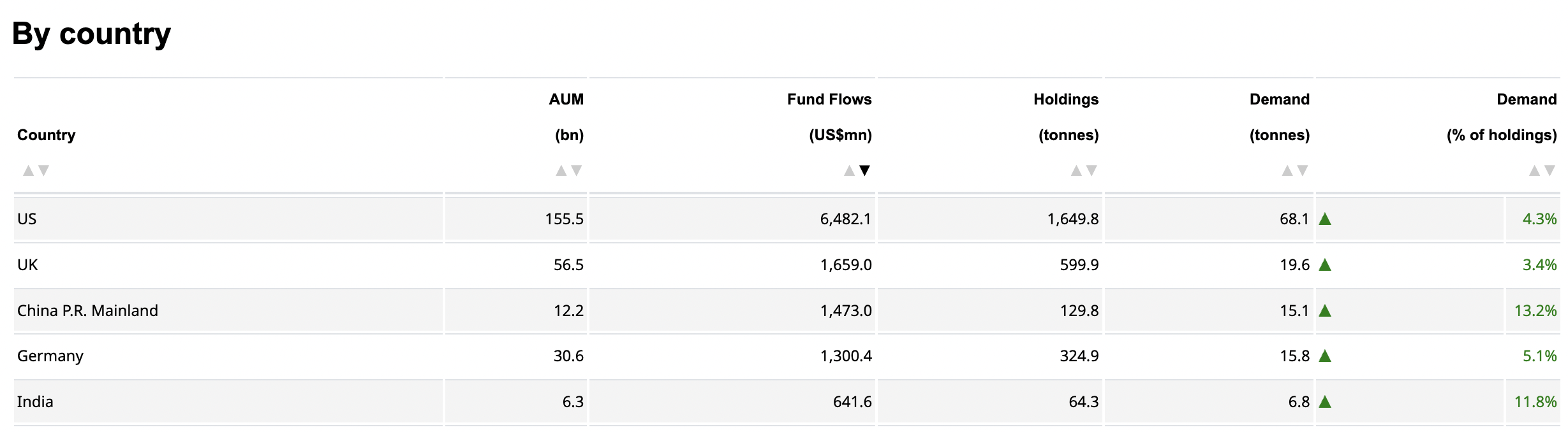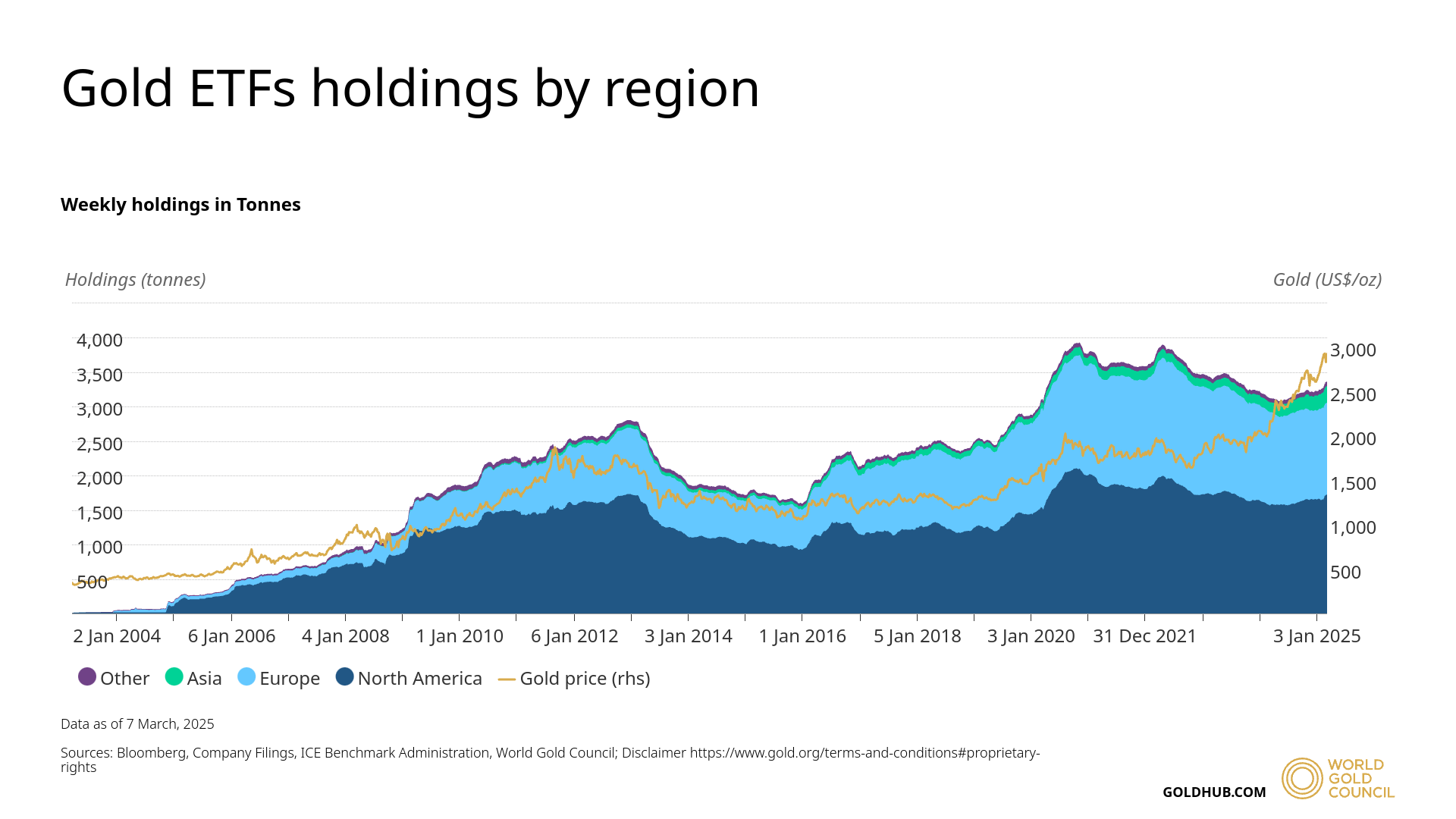 Wöchentliche Bestände an Gold -ETFs in jeder Region Quelle: Goldhub.com