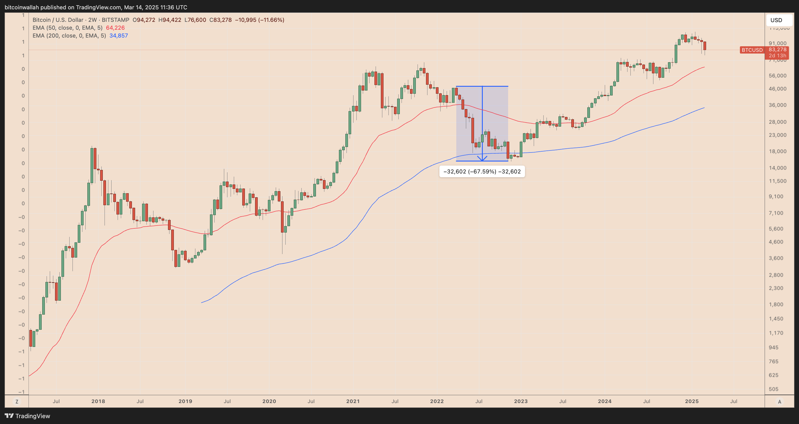 Wenn dieses Bitcoin-Gold-Fraktal wiederholt wird, könnte das Bitcoin-Downside-Ziel 2025 auf 34.850 US-Dollar auf der Grundlage der 200-Perioden-EMA von zwei Wochen (den blauen Wellen) gedrängt werden.