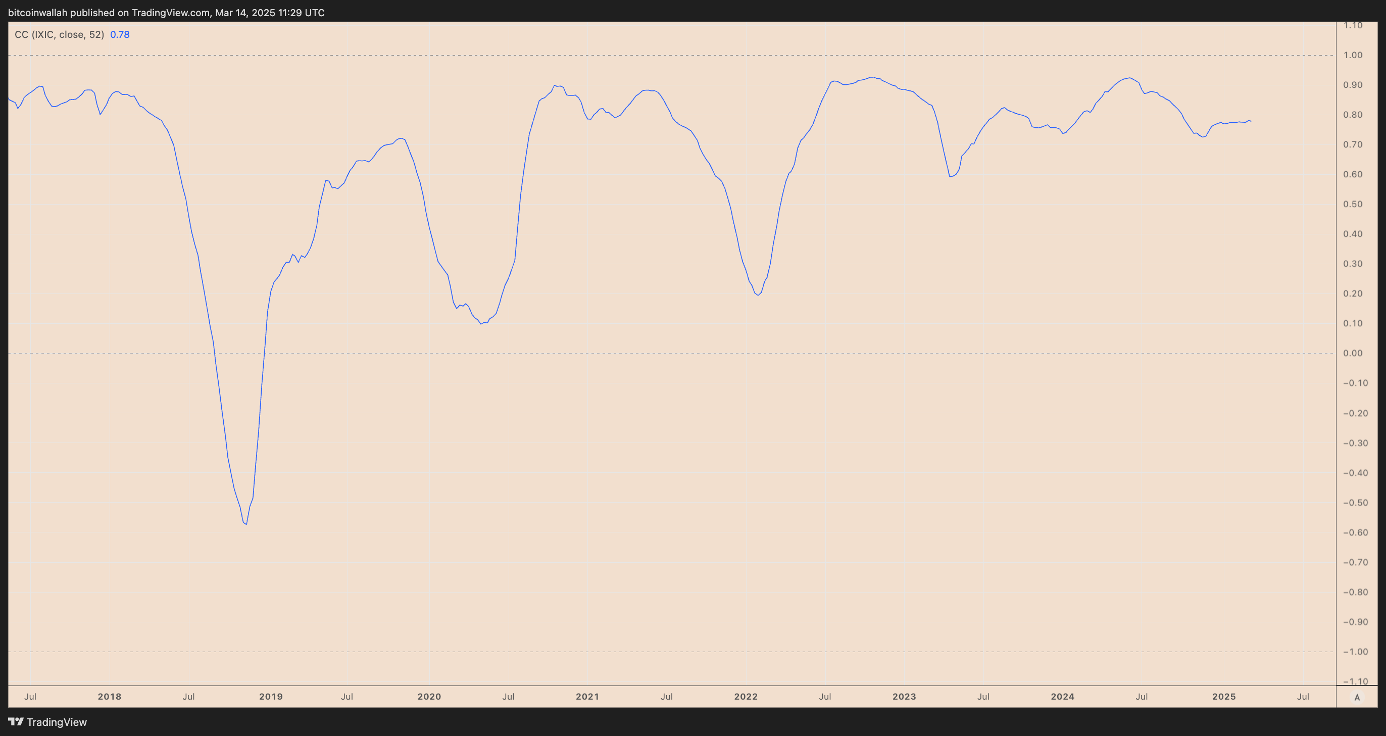 BTC/USD vs. Nasdaq Composite 52-Wochen-Korrelationskoeffizientendiagramm. TradingView