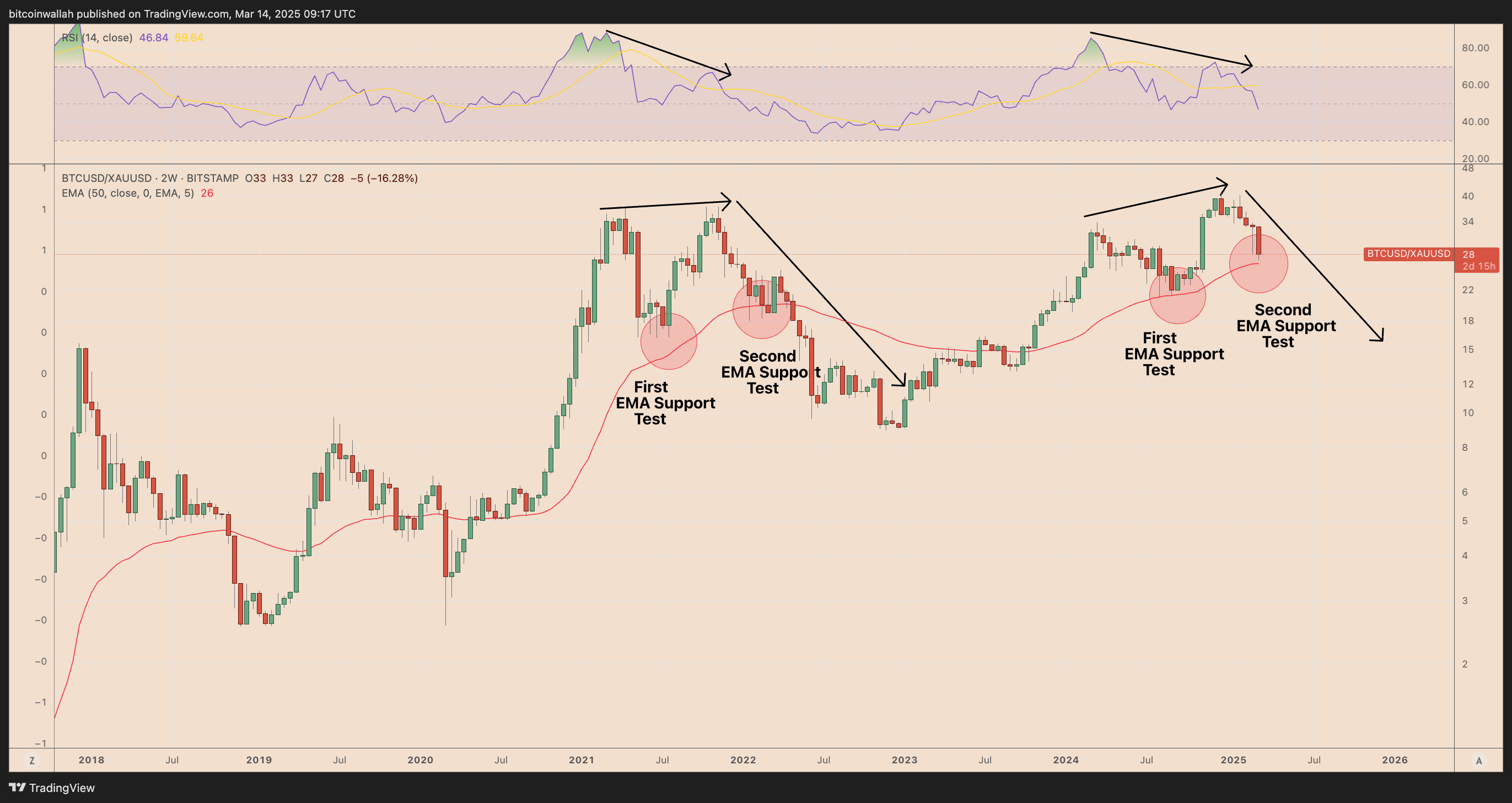 Es ist wichtig zu beachten, dass das Wort „Sie“ „Sie“ bedeutet. Aktueller Bitcoin-zu-Gold-Zusammenbruch Übereinstimmt auf historische Muster, insbesondere auf den Fraktal von März 2021 bis März 2022, der dem letzten Bärenmarkt vorausging.