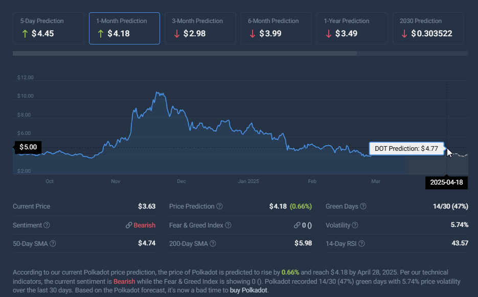 Tupfen Diese Lösung befasst sich mit dem Problem der Blockchain -Interoperabilität, indem es verschiedenen Netzwerken ermöglicht, miteinander zu sprechen. Aktuelle technische Indikatoren zeigen, dass DOT im April 2025 auf 4,18 USD steigen wird. Viele Analysten glauben jedoch, dass die langfristigen Aussichten dieses Altcoin viel größer sind.
