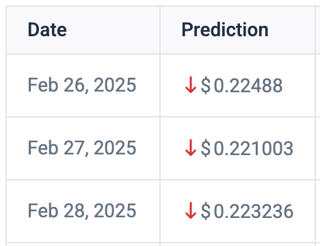 Sieht so aus, als würde Tron TRX 'Abwärtstrend auch Ende Februar fortgesetzt. Daten von coincodex zeigen, dass das Altcoin bis Ende Februar voraussichtlich bei 0,223236 USD handeln wird. Die Anleger erwarten einen Anstieg dieses Vermögenswerts im März 2025, obwohl es unwahrscheinlich ist, dass er sich bis zum Ende des Monats erholt.