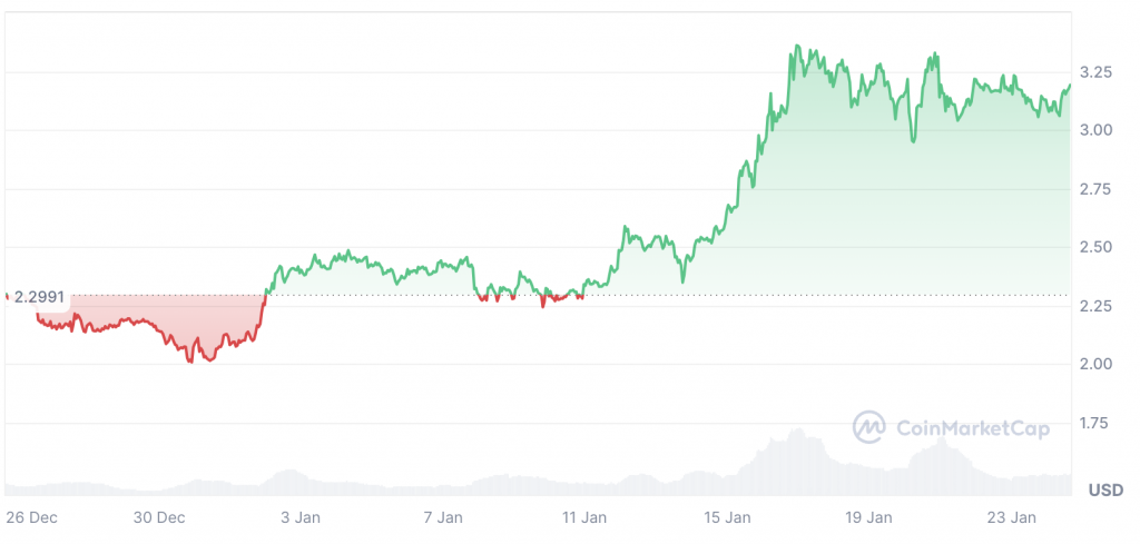 Während der Veröffentlichung wurde die drittgrößte Kryptowährung bei 3,19 USD gehandelt. Der Vermögenswert hat in den letzten 24 Stunden einen Anstieg von 3,35% verzeichnet, was XRP von seinem Tiefpunkt von 3,04 USD bis zu seinem aktuellen Wert ermöglichte. Insbesondere im Januar stiegen die meisten Vermögenswerte langsam voran. Im Gegenteil, XRP war erstaunlich um 38%.