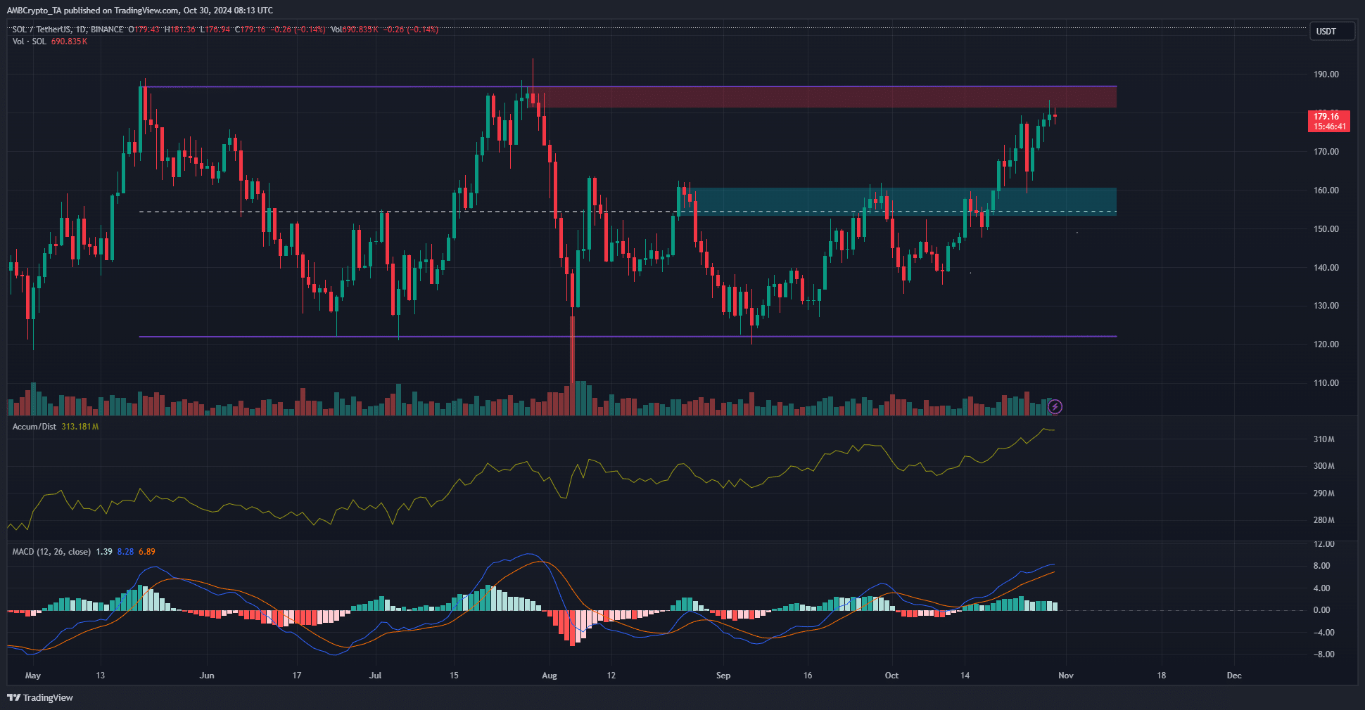 Solana [SOL] Testete die Unterstützungs- und Widerstandszonen von 180 $, konnte sie jedoch nicht in eine positive Zone umwandeln. Die Preisbewegung zeigte, dass Dynamik und Stimmung nicht im Einklang waren. waren bullishWeitere Gewinne könnten schwer zu erreichen sein.
