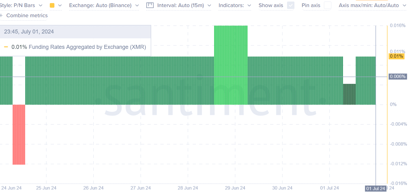 AMBCrypto untersuchte auch die XMR-Stimmung und stellte fest, dass die Finanzierungsrate, aggregiert nach Börsen, in den letzten sieben Tagen positiv war.